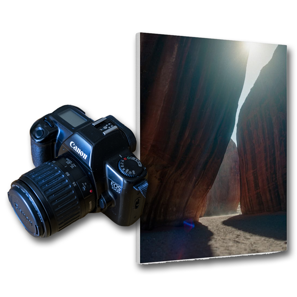 Canon EOS 1000 35mm film camera and a canvas print of a slot canyon in Utah.
